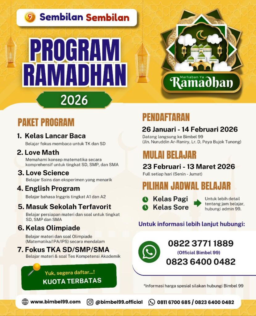Yuk, segera daftar! Langsung datang ke Bimbel 99 (Jln Nuruddin Ar-Raniry, Lr. D, Paya Bujok Tunong, Langsa) atau melalui website Bimbel 99.