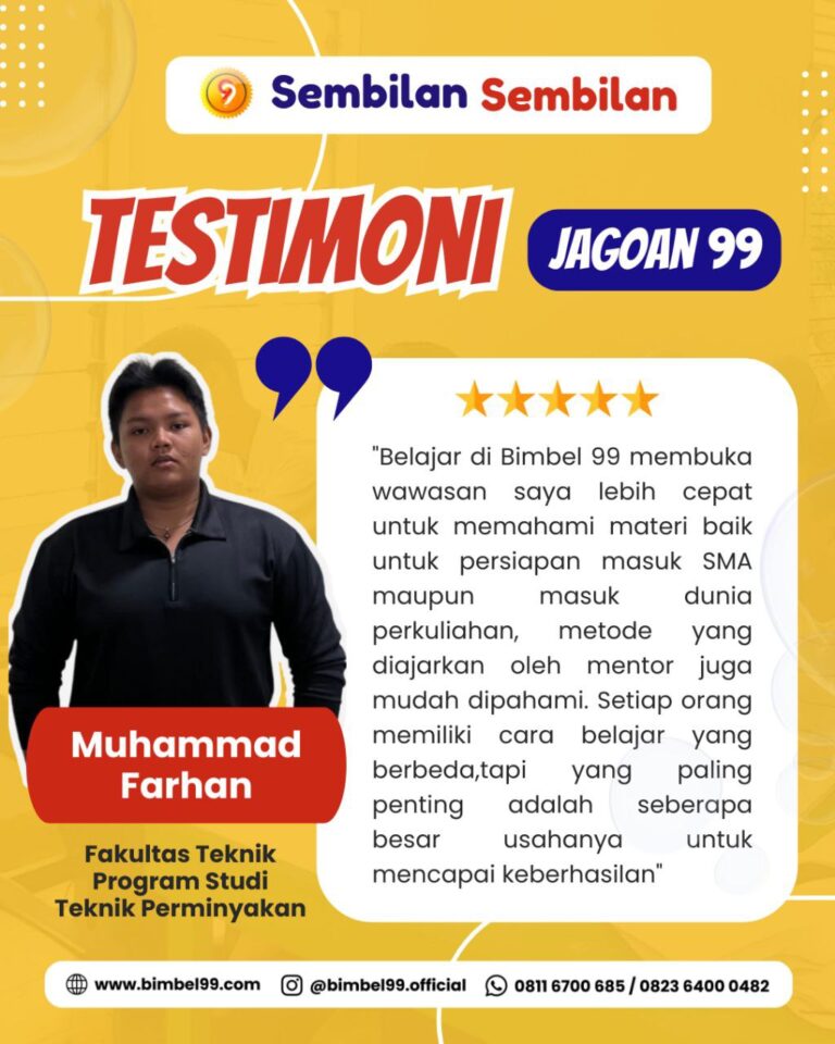 “Belajar di Bimbel 99 membuka wawasan saya lebih cepat untuk memahami materi baik untuk persiapan masuk SMA maupun masuk dunia perkuliahan,metode yang diajarkan oleh mentor juga mudah dipahami.Setiap orang memiliki cara belajar yang berbeda,tapi yang paling penting adalah seberapa besar usahanya untuk mencapai keberhasilan”