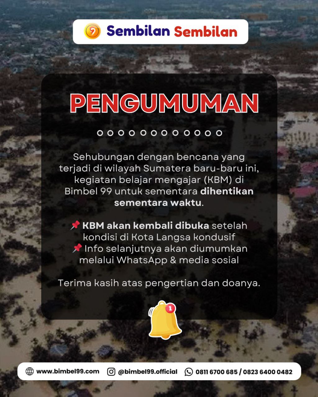 Sehubungan dengan bencana yang terjadi di wilayah Sumatera, kegiatan belajar mengajar (KBM) di Bimbel 99 untuk sementara dihentikan.
